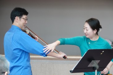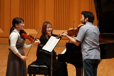 1日は午前中に公開レッスンを開催し、白井圭氏のヴァイオリンレッスンを3名のSTROANメンバーが、叶澤尚子氏のヴィオラレッスンを2名のメンバーが受講しました。どの受講生も技術や音楽的表現の助言を受け、演奏に磨きがかかり楽器の響きが増していく様子が印象的でした。
