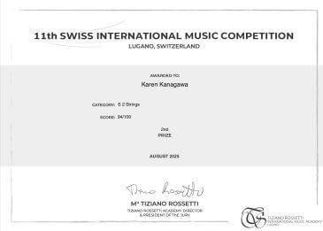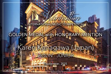 2025年度開催の第9回マンハッタン国際音楽コンクールにて、特別誉賞付き金賞受賞という栄誉をいただきました。「競争の激しい国際舞台の中でも際立つ存在」との評価をいただき深く感動しています。これからも、自分らしい音楽性と情熱を大切にしながらステップアップできるように日々頑張ってまいります!