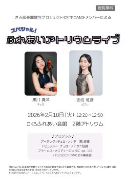 毎週火曜日12:20~12:50にOKBふれあい会館2階のアトリウムにて開催の「ふれあいアトリウムライブ」の2月10日(火)の回に、STROANメンバーの黒川真洋が出演いたします。